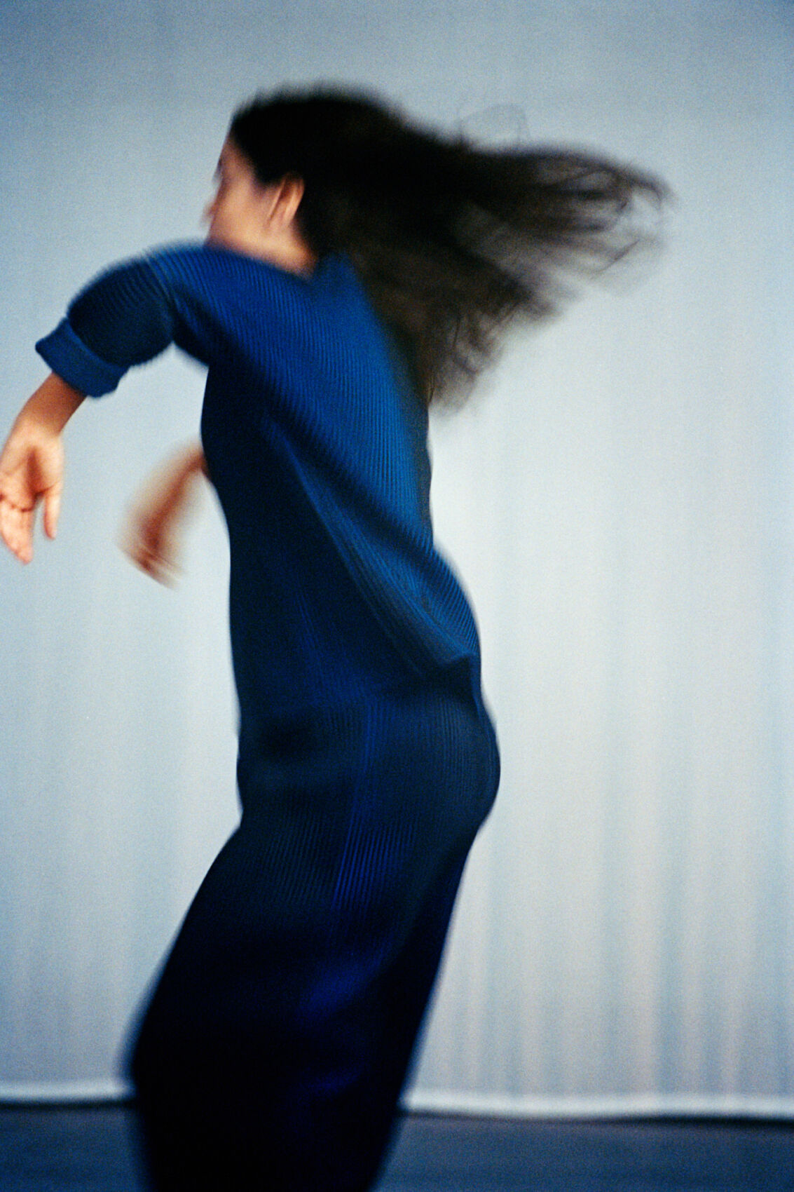A person with long hair moves gracefully, wearing a dark blue outfit. The motion captures dynamic energy, with hair and limbs slightly blurred against a softly neutral background. The sense of movement suggests a dance or a spontaneous expression, creating a vibrant, fluid impression while focusing on the elegance and freedom of the action.