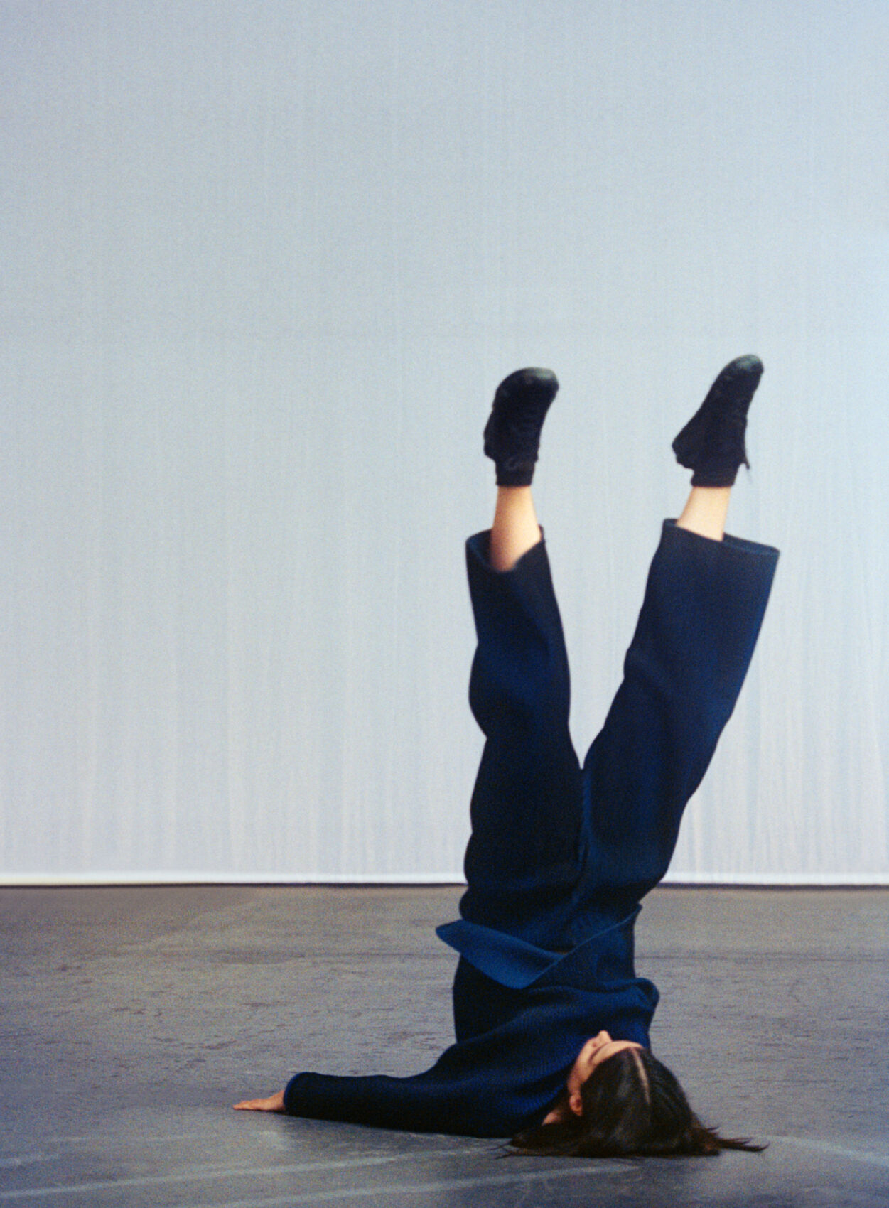 A person wearing a dark blue outfit performs a headstand on a dark surface. Their body is inverted, with hands on the ground and legs pointed upward. The background is a plain, light-colored backdrop. Their black shoes contrast with their attire, and the scene conveys a sense of balance and poise within a minimalist setting.