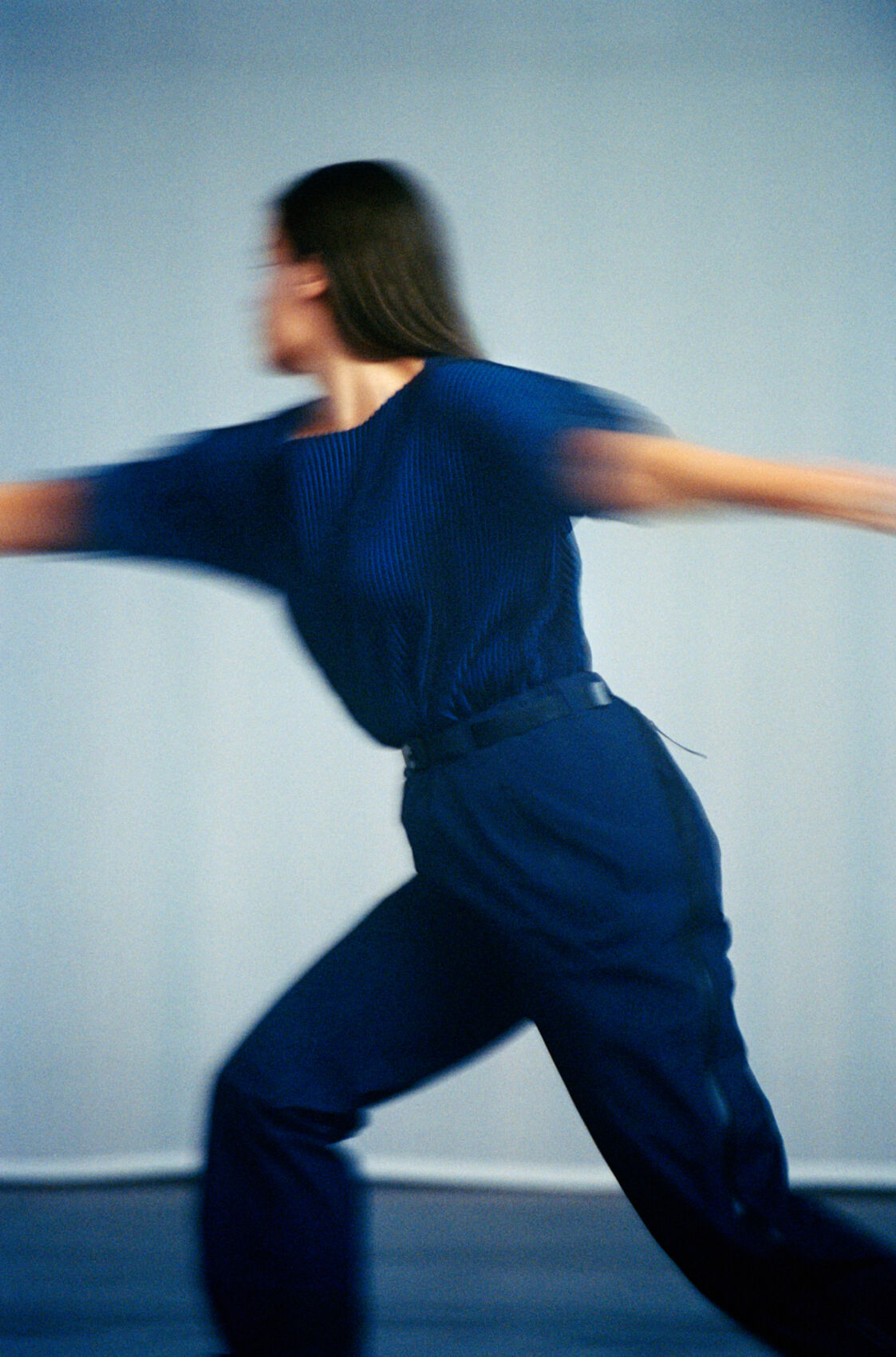 A person, captured in motion, is wearing a blue, loose-fitting outfit against a plain background. Their head turns to the side, while their arms extend outward, suggesting dynamic movement, possibly dancing or exercising. The image conveys a sense of freedom and energy, with blurred details contributing to the feeling of swift action and fluidity.