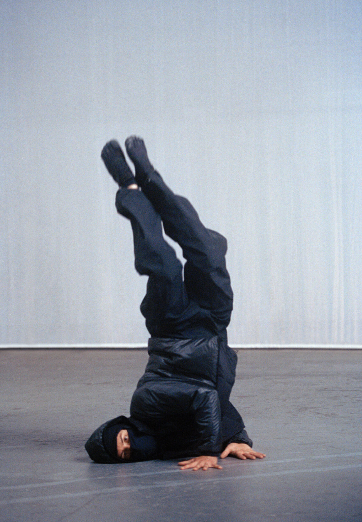 A person dressed in all-black attire, including a hood and mask, performs a headstand on a smooth, gray surface. Their legs are pointed upwards, demonstrating balance and flexibility. The background features a plain, light gray wall, creating a minimalist and focused atmosphere. Their hands are positioned on the ground for support, highlighting physical skill.