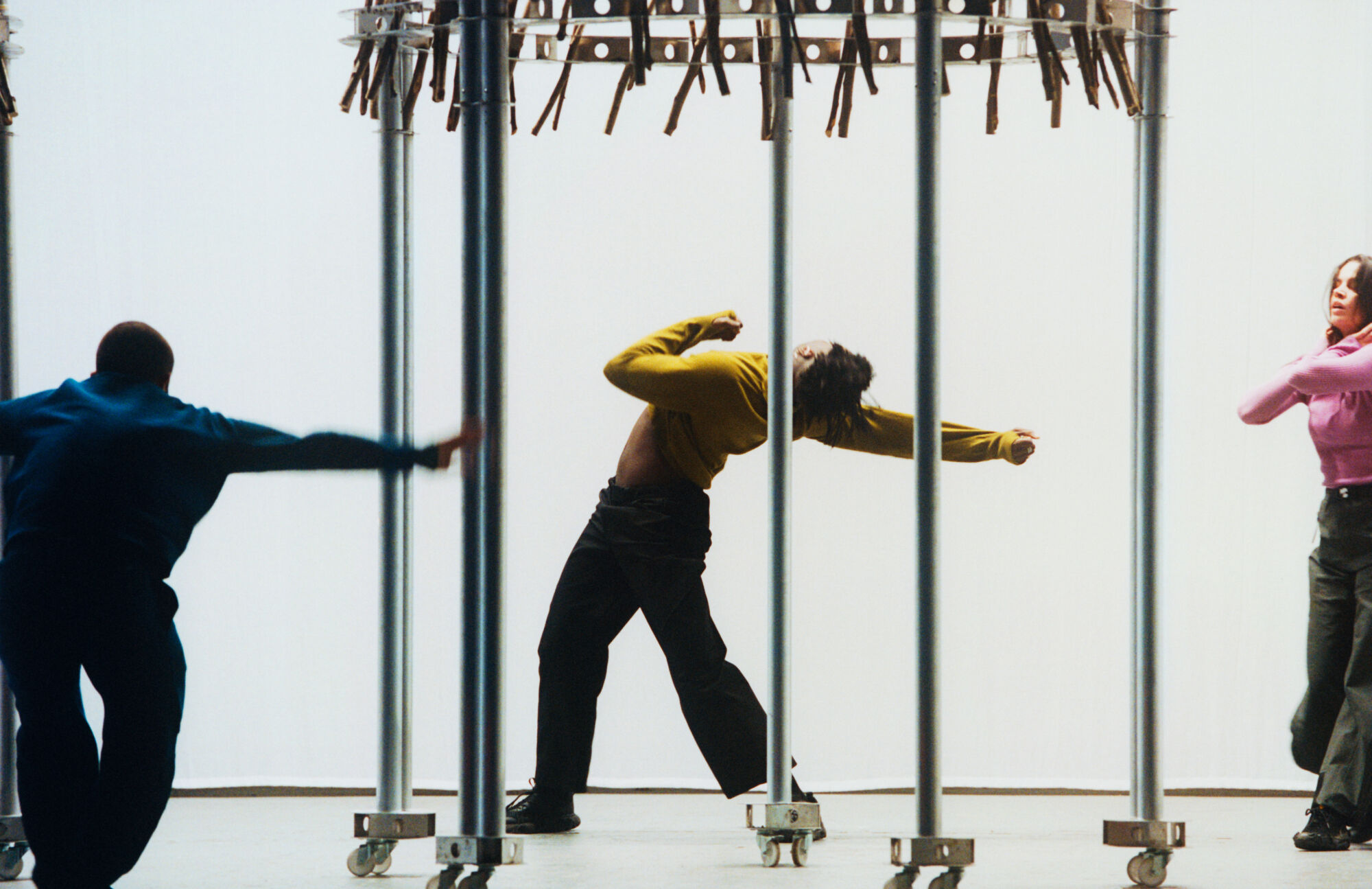 Three individuals are dancing energetically within a metal structure on wheels. One wears yellow, striking a dynamic pose, another in blue leans forward, and the third in pink moves gracefully. The background is minimal, emphasizing the performers' movements. The arrangement of the poles adds a geometric element, creating a sense of rhythm and motion.