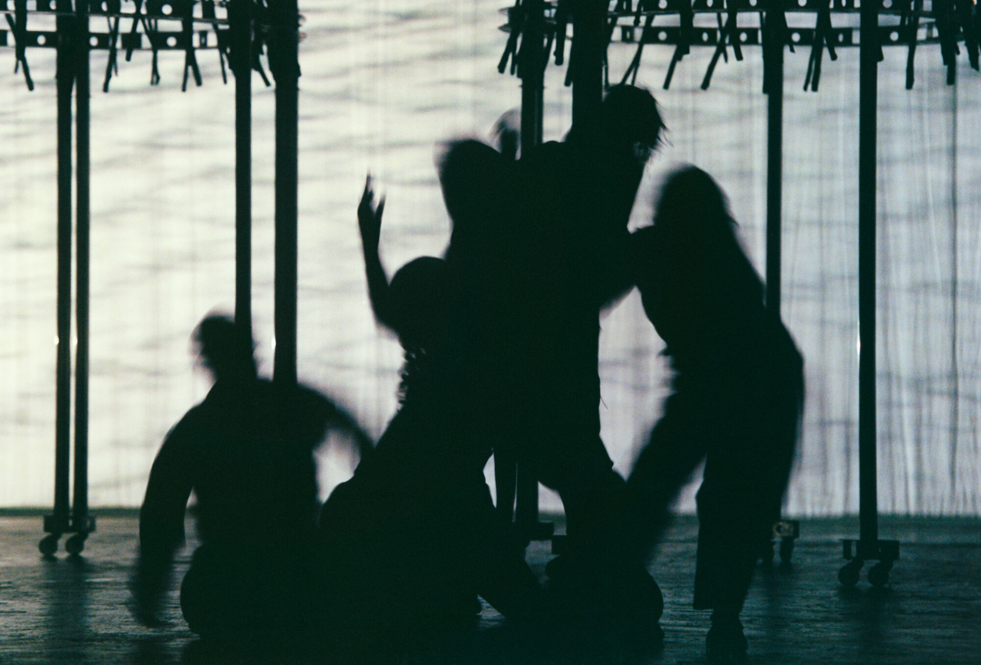 Silhouettes of five figures engage in dynamic poses against a bright, textured background. The composition conveys movement and interaction, suggesting a scene of dance or performance. Overhead, a row of hanging objects creates a dramatic contrast. The overall mood is mysterious and evocative, blending shadow and light to create a striking visual narrative.