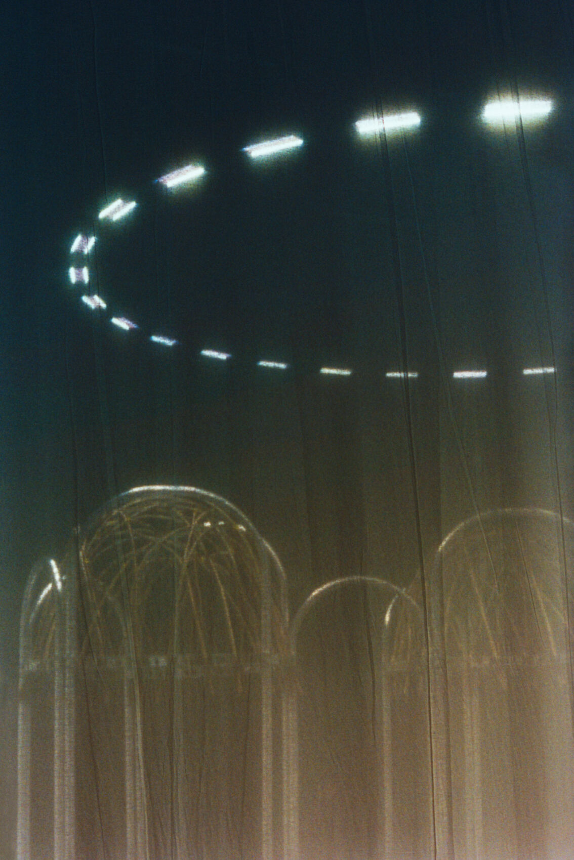 Soft lighting casts a mysterious yet serene atmosphere over the scene. Glowing arches rise towards a hazy sky, partially shrouded by semi-transparent fabric, creating an ethereal effect. A circular arrangement of light trails draws attention, hovering above the arches, suggesting motion or an artistic light installation. The composition evokes curiosity and a sense of wonder.