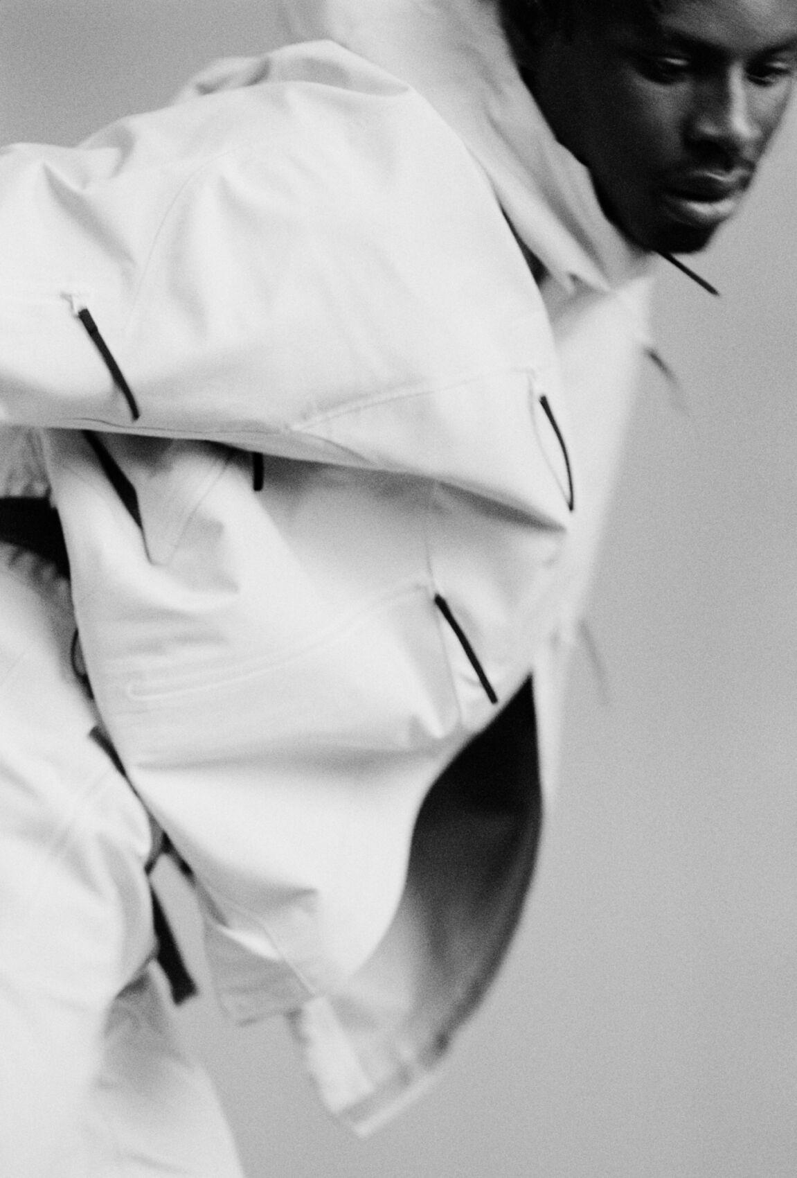 A person is captured in a dynamic pose, wearing a light-toned jacket with several zippered pockets. The composition is off-center, emphasizing the fluid motion of the figure. The background is a soft, neutral shade, enhancing the focus on the fabric and movement. The overall aesthetic is minimalist and contemporary, with a monochromatic black and white palette.