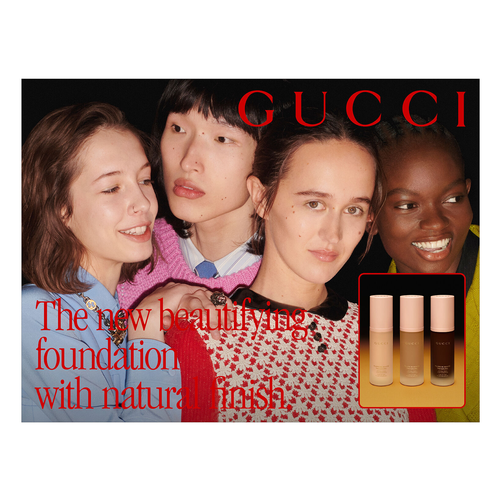 Four individuals stand closely together, each showcasing a distinct style and personality. They are dressed in a variety of colorful clothing, exuding a vibrant and spirited atmosphere. To the side, there are four cosmetic bottles in a small display, representing different shades. The overall theme suggests diversity, inclusivity, and the appeal of beauty products.