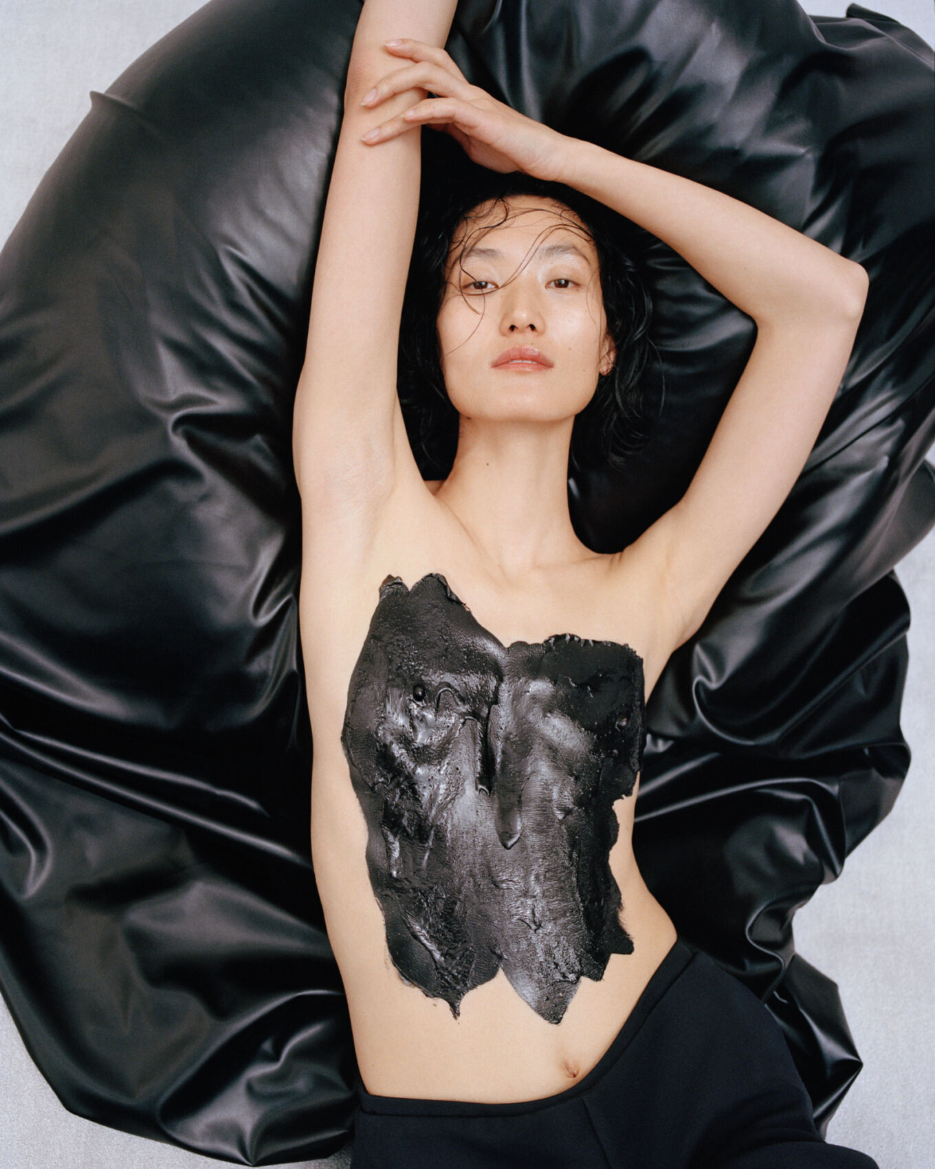 A person with shoulder-length dark hair reclines on a black, textured surface. Their arms are raised, one hand resting on their forehead. They wear dark pants, and their torso is adorned with an abstract black paint design. The composition highlights a serene, artistic expression and a blend of textures, focusing on contrast and minimalist aesthetics.