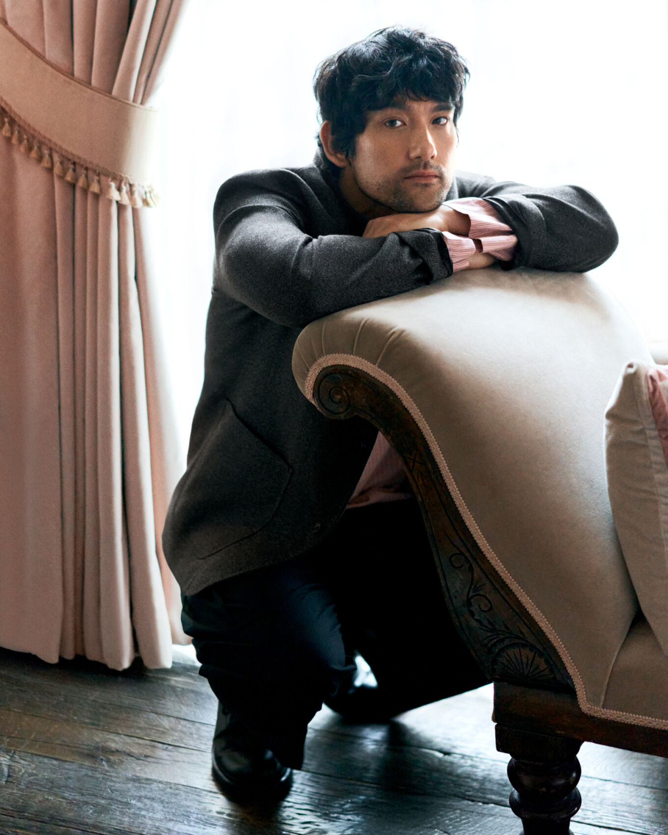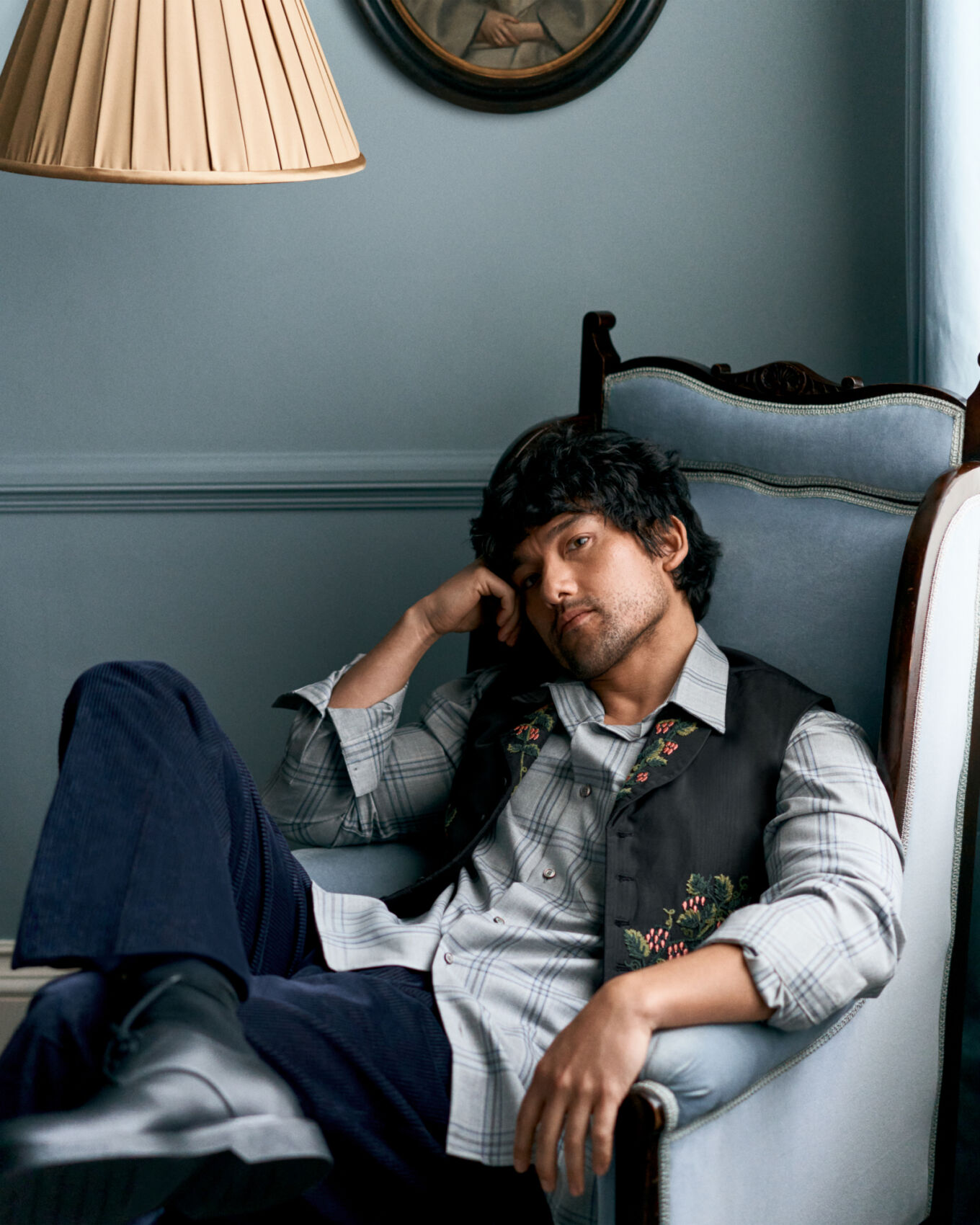 A relaxed man lies on patterned stone tiles, smiling softly while touching his eye. Tousled dark hair frames a stubbled face. He wears a velvet jacket over a structured blue shirt with decorative straps. One hand rests on his stomach, conveying playful elegance and confident ease under bright daylight subtle shadows highlight texture, tailoring, personality, warmth, charm, poise, style, presence.
