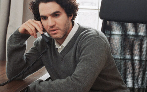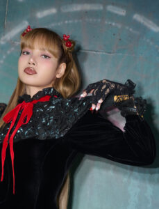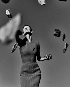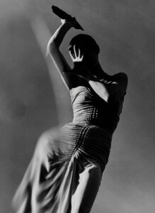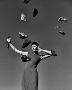 A person is reclining against a stark white background, partially concealed in a sheer, crinkly wrap. They wear a striking pair of high heels with red soles and sparkly detailing. Their hair is styled in a sleek, dark bob with bangs, and their pose is both casual and elegant, with one leg bent and the other extended gracefully.