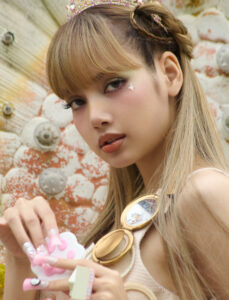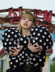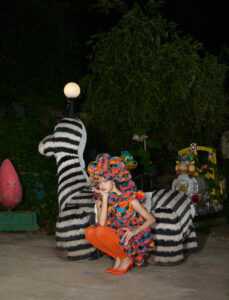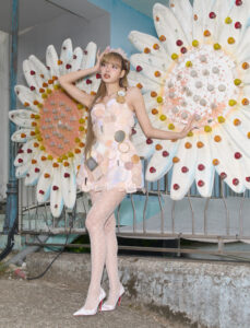 Three individuals are styled in elegant outfits, featuring light tones and sophisticated accessories. Two are standing, each holding a patterned bag, while one is seated gracefully. The background boasts cheerful cartoon flowers and characters, providing a playful and vibrant contrast to the chic fashion showcased in the foreground. The overall scene merges style with whimsy.