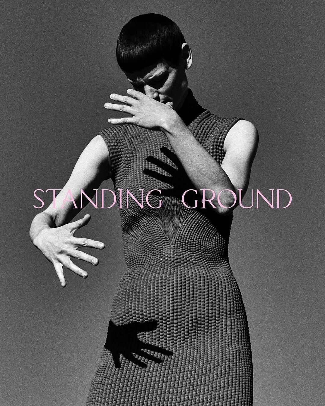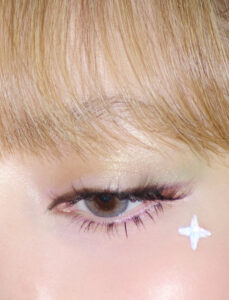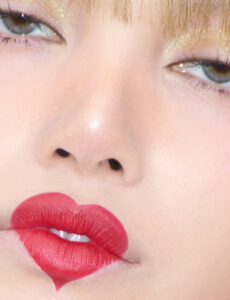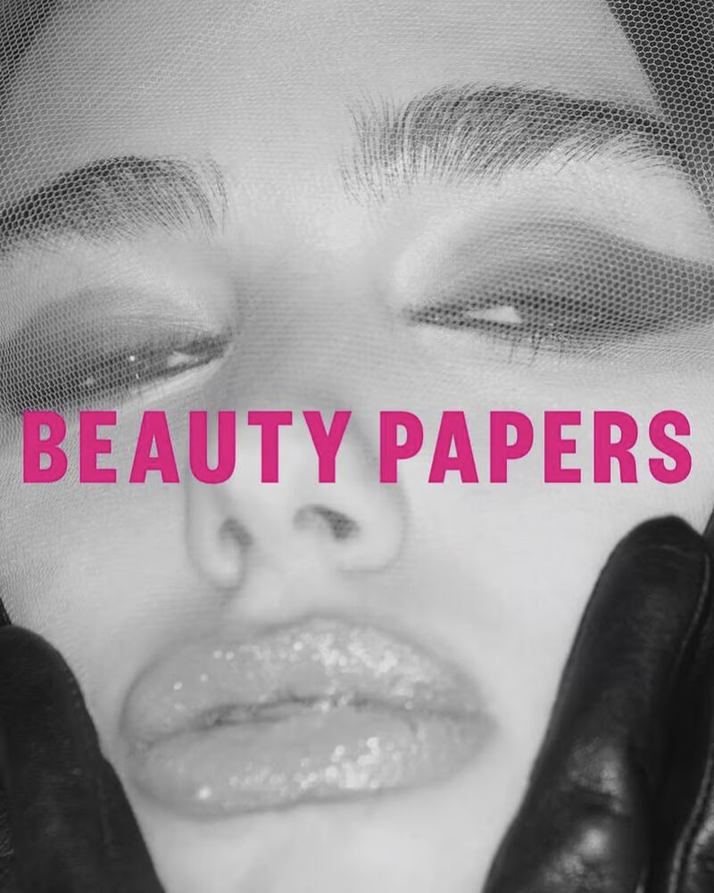 A face is partially obscured by a mesh fabric, adding a textured overlay to smooth skin. The closed eyes are accentuated by dark, dramatic eyeshadow. Glossy lips are slightly parted, creating a reflective sheen. A hand in a black glove gently touches the chin, contributing a contrast in texture and color to the soft, monochrome tones.