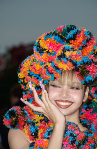 A lively crowd is adorned in colorful attire, featuring pink cowboy hats and various vibrant costumes. Some wear fluffy or sequin-laden outfits, while others accessorize with gloves and glitter. The atmosphere is festive and energetic, as people raise their hands and dance in close proximity, creating a scene filled with dynamic movement and exuberant celebration.