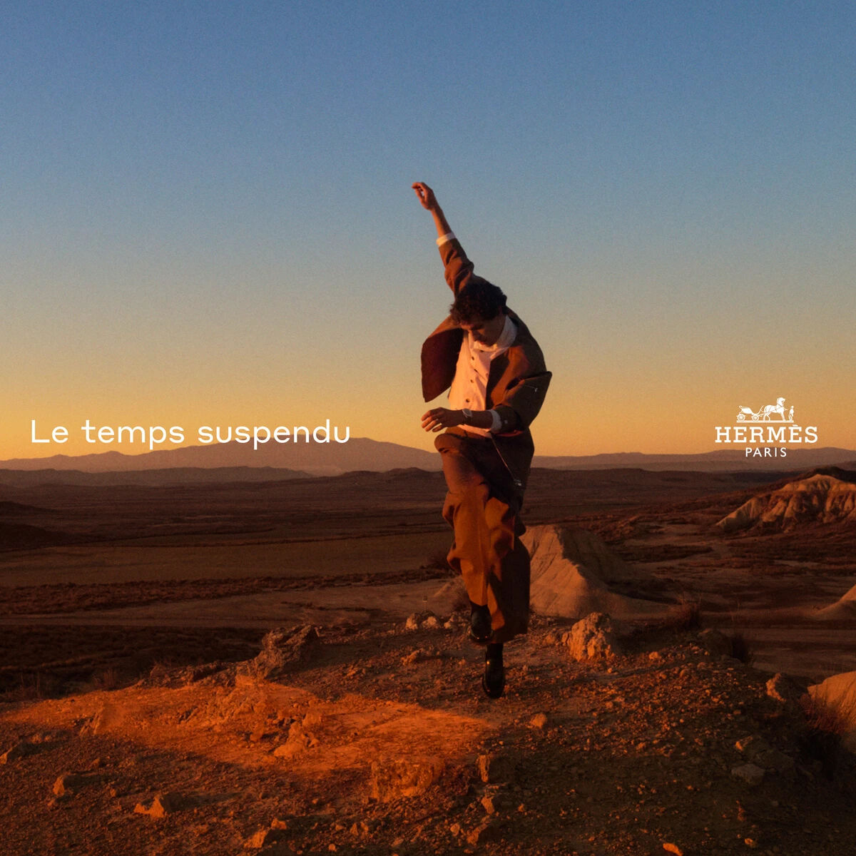 A person dressed in formal clothing appears carefree and dynamic against a vast desert landscape. The sun casts a warm, golden glow over the scene, illuminating the surroundings with soft light. The horizon stretches far, with distant mountains visible under the clear sky. The moment captured conveys movement, exploration, and a sense of freedom amid nature.