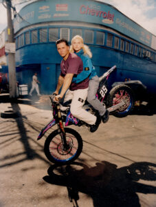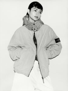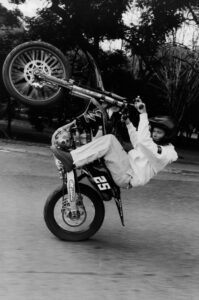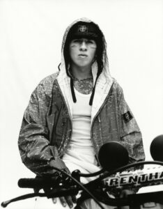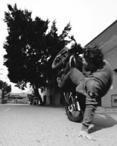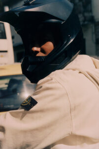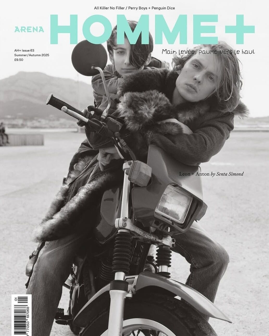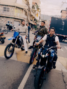 Two individuals pose on a motorcycle, with one seated behind the other, both wearing fur-collared jackets. Their expressions are calm and introspective. The setting appears to be outdoors, with distant mountains and a blurred background, suggesting a casual yet stylish atmosphere. The composition evokes a sense of adventure and fashion-forward attitude.