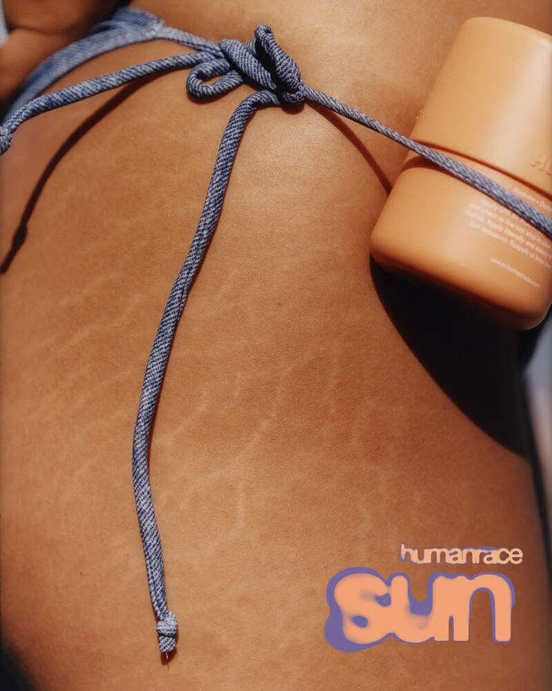 A close-up of a sun-kissed back showcases a blue rope-tied bikini strap with a container nestled between the strap and skin. The creamy, smooth texture of the skin contrasts with the vivid blue fabric and the bright orange of the container. Sunlight accentuates the contours and shadows, highlighting the relaxed, summery vibe.