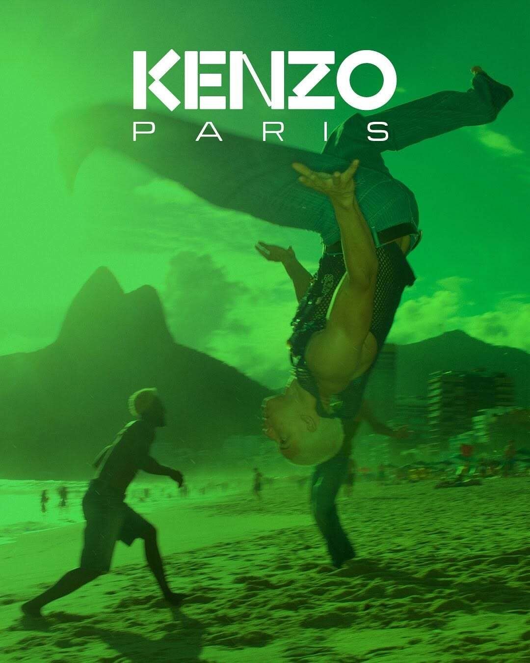 A vibrant scene depicts a person performing an acrobatic flip on a sandy beach under a greenish sky. In the background, figures are silhouetted against two large mountains and towering buildings. The atmosphere is dynamic, suggesting a lively, urban beach environment with a sense of energy and movement amidst natural and architectural elements.