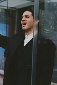 A person with long, dark hair styled in braids gazes thoughtfully. They are wearing a crisp white shirt, creating a minimalist and elegant appearance. Large geometric silver earrings and a matching ring add a touch of modern sophistication. Their hand rests on their face, contributing to a contemplative mood, set against a plain, light-colored background.