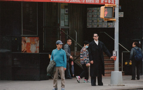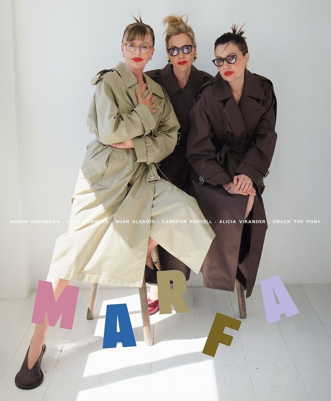 Three individuals, each wearing oversized trench coats, sit together on high stools. They all sport bright red lipstick and stylish sunglasses, exuding a chic and confident aura. Their poses are relaxed yet poised. The setting is minimalist, with a white backdrop that enhances the vibrant colors of their attire and makeup. Shadows are cast on the floor.
