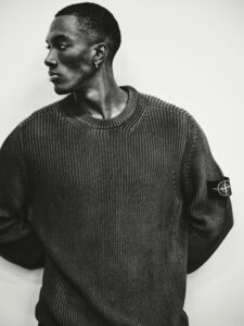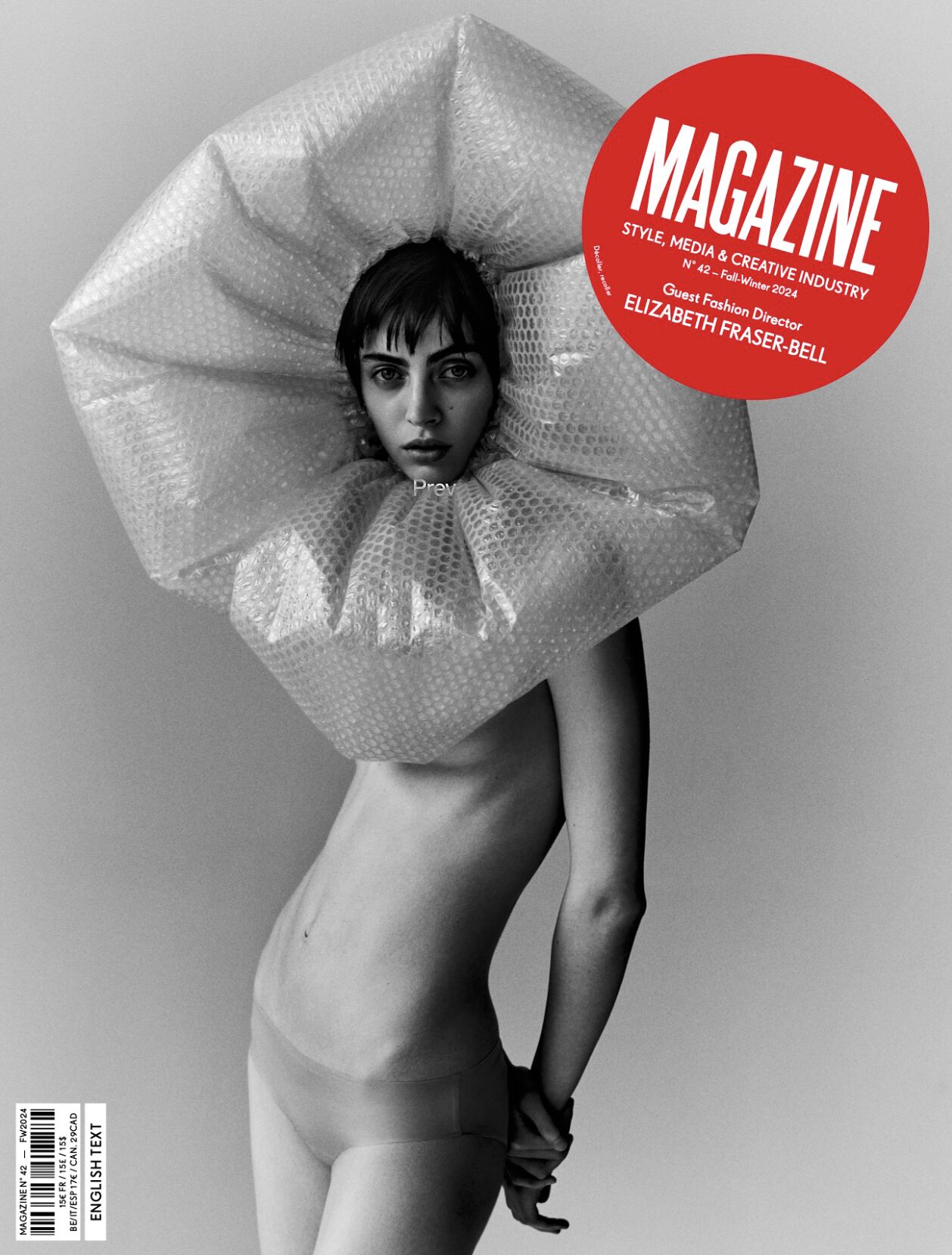 A monochrome composition features a figure posed elegantly, draped in minimal attire with a distinctive head accessory crafted from bubble wrap, creating a ruffled, collar-like structure encircling the face. The figure's gaze is direct and introspective. Hand placement at the back adds to the composed stance. Shadows and lighting enhance the contours and textures, blending fashion with art.