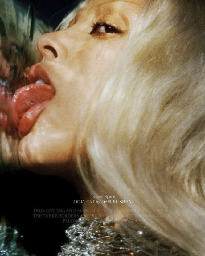A person with long, light blonde hair is depicted. Their open mouth is pressed against a reflective surface, with the tongue visible. The skin is illuminated, highlighting facial features, primarily focused on the nose and eye. The lower garment or jewelry is sparkly and textured, suggesting an artistic or avant-garde style. The mood conveys surrealism and curiosity.