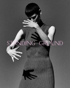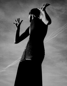 Three individuals stand under a bright blue sky, wearing dramatic black cloaks and white garments with bold, contrasting designs. Each person displays unique headwear and attire that blend modern and traditional styles. The angular and flowing fabrics create a striking visual effect, emphasizing texture and form. Their expressions are serene, adding a sense of elegance and mystery.