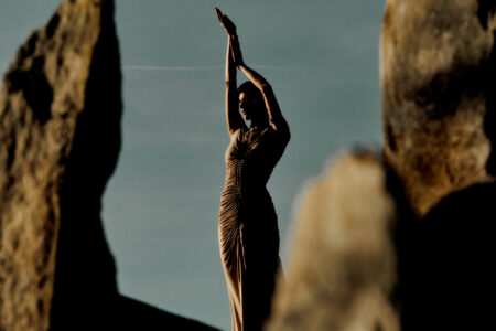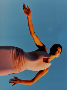 A person with light eyes and neutral makeup gazes upwards, embodying a serene expression. Their blonde hair flows gently, complementing the tan, intricately designed outfit they wear. The garment features a notable gold buckle and creative cutouts, adding an artistic flair. Soft lighting enhances the overall elegance, creating an intimate and stylish atmosphere.