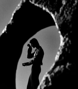 A stylized, blurred silhouette of a person facing left, enveloped in textured, voluminous fur or faux fur clothing. The background is softly lit, creating a dreamy and abstract atmosphere. The soft focus adds a sense of mystery and elegance to the scene, emphasizing the luxurious material and the contemplative pose of the figure.