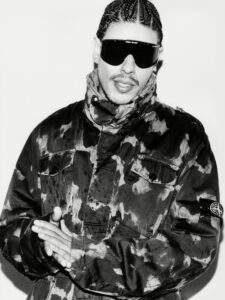 A person wears a colorful headscarf with a bold pattern, covering their hair. Glasses rest on their nose, and they sport a serious expression. They're dressed in a vibrant pink jacket with black details. The background is blurred, creating a soft, neutral backdrop that highlights their strong presence and distinctive style in the foreground.