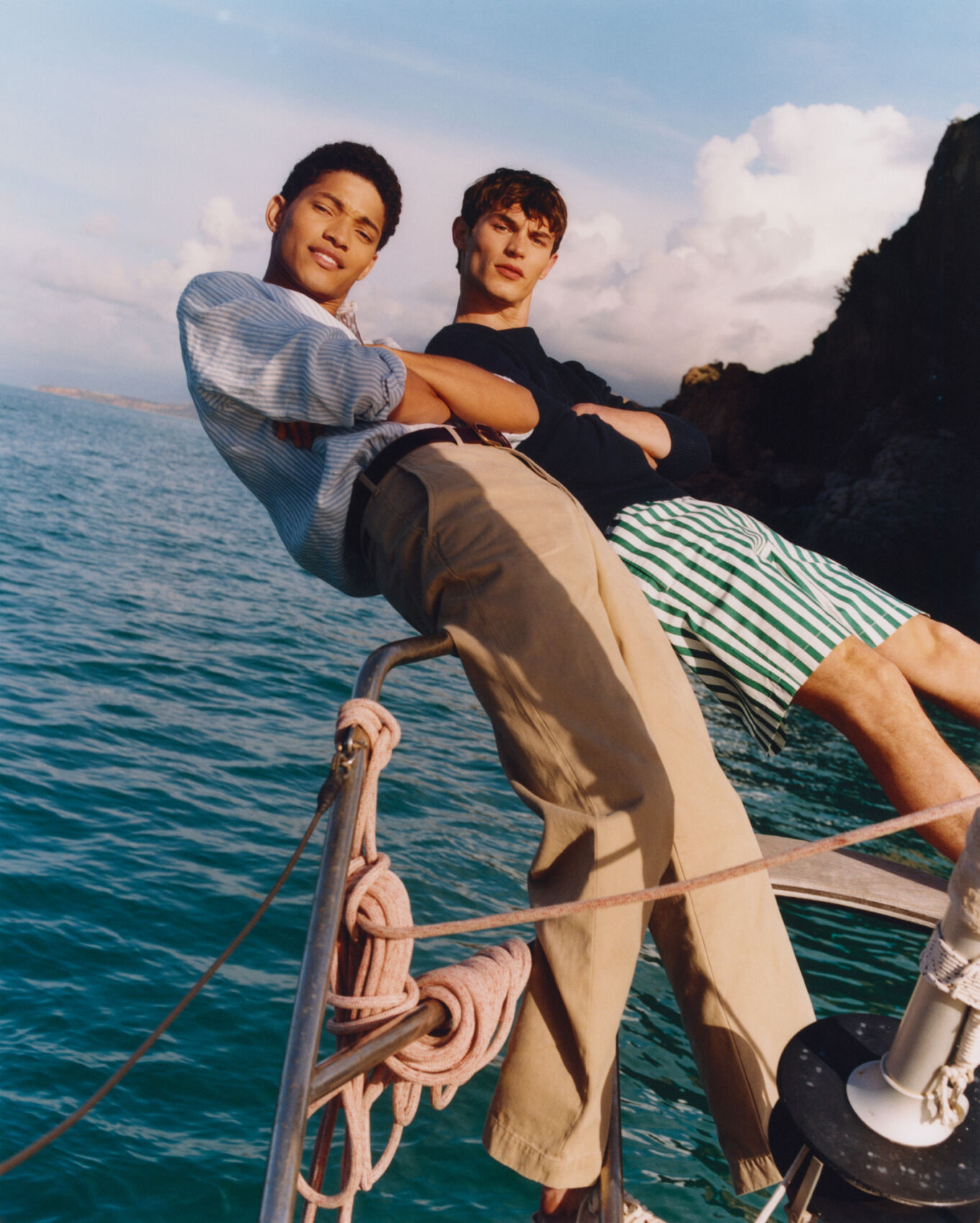 Two individuals appear relaxed on the bow of a boat, leaning back with arms folded. They are set against a backdrop of clear blue water and a distant rocky coastline under a sky filled with fluffy clouds. One wears a striped shirt and beige pants, while the other sports a dark top and striped shorts.