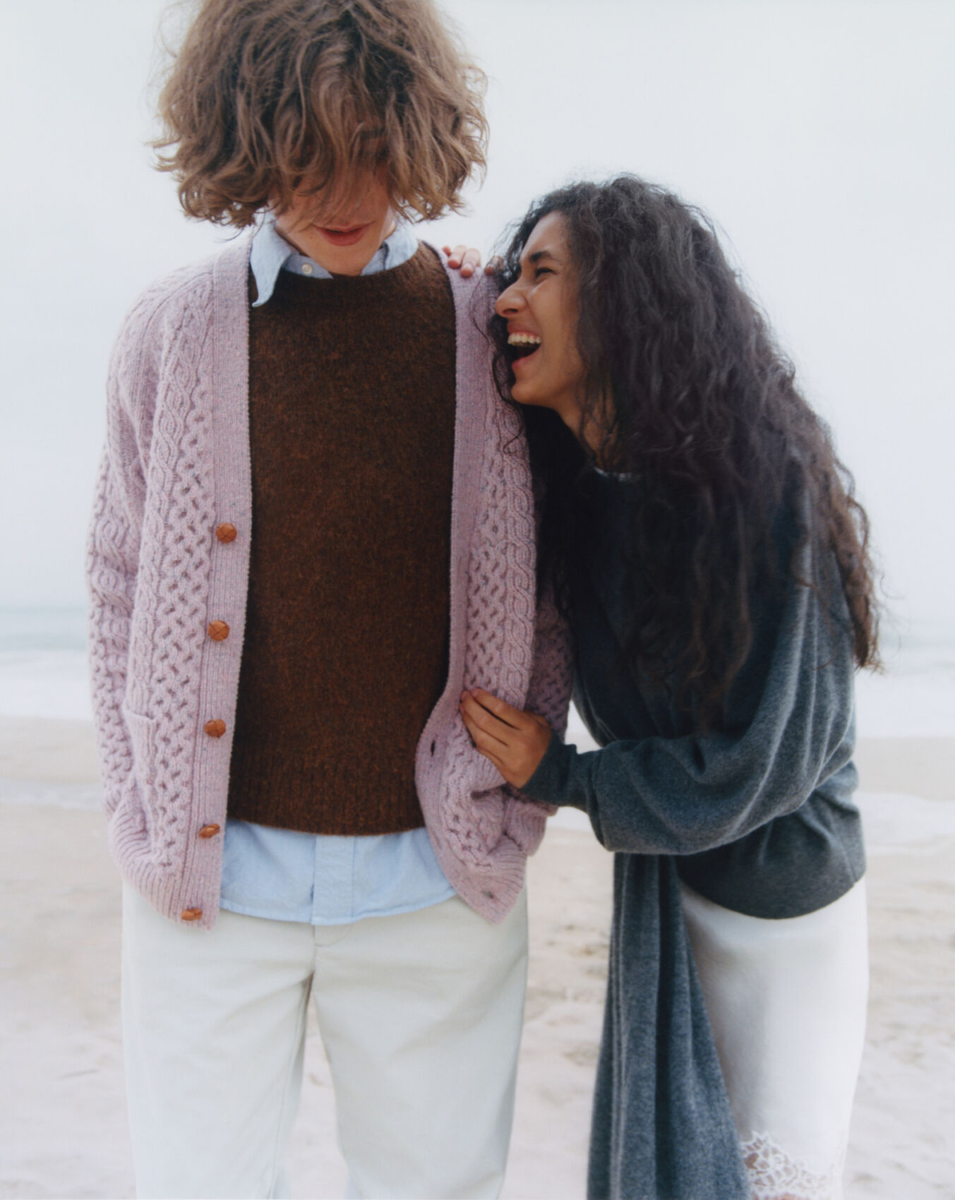 Two people are on a beach, sharing a light-hearted moment. One wears a brown sweater under a light pink cardigan, and the other, in a dark, long-sleeved top, leans in laughing. Both are dressed in light-colored bottoms. Their relaxed posture and the serene background suggest a casual, joyful atmosphere amidst the natural backdrop of sand and sea.