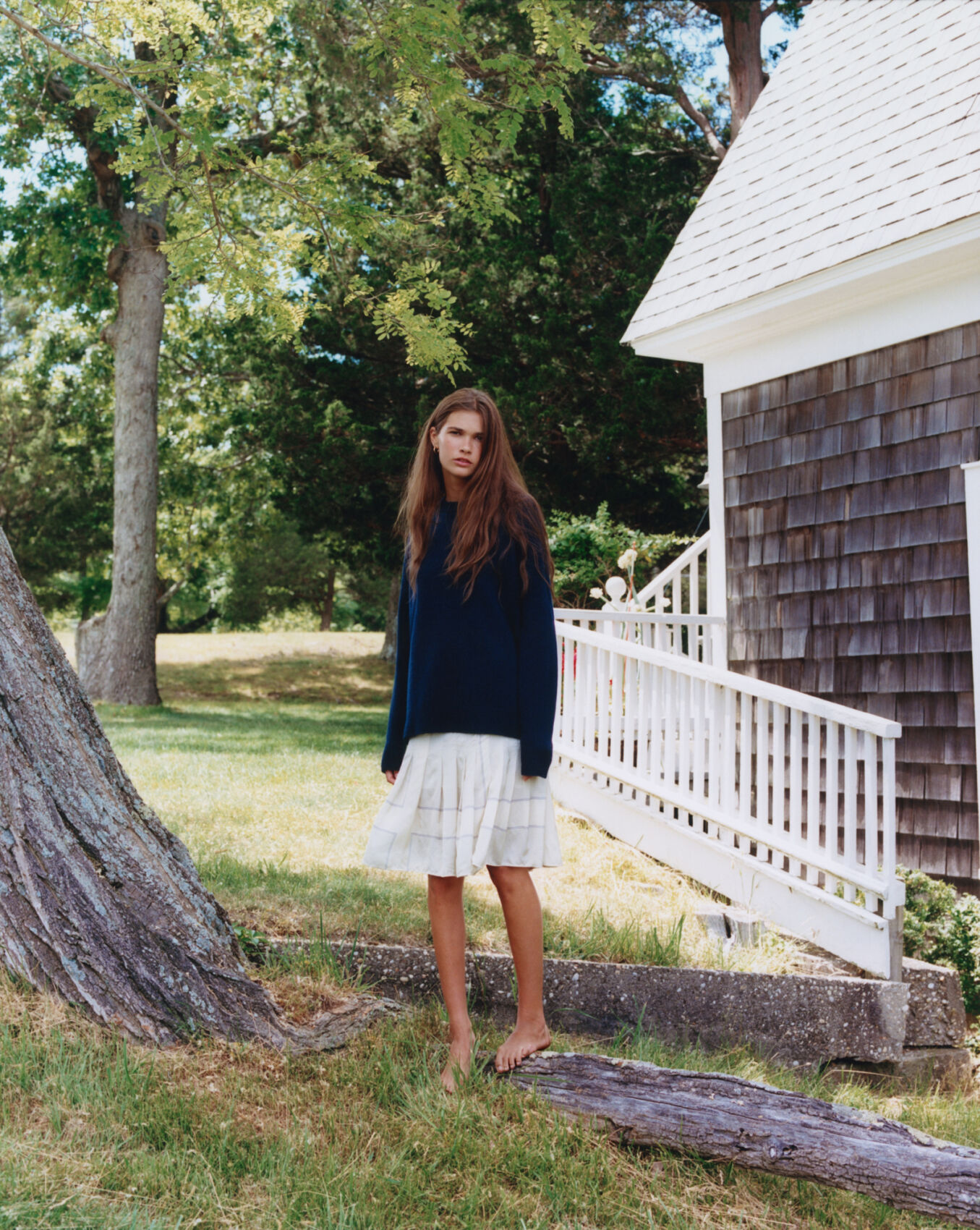 A person with long brown hair stands barefoot on a grassy area near a large tree trunk. They are wearing a dark blue sweater and a white skirt. In the background, there is a white-railed wooden structure with shingles, surrounded by lush green trees and a bright, sunny sky. The scene conveys a serene, rural setting.