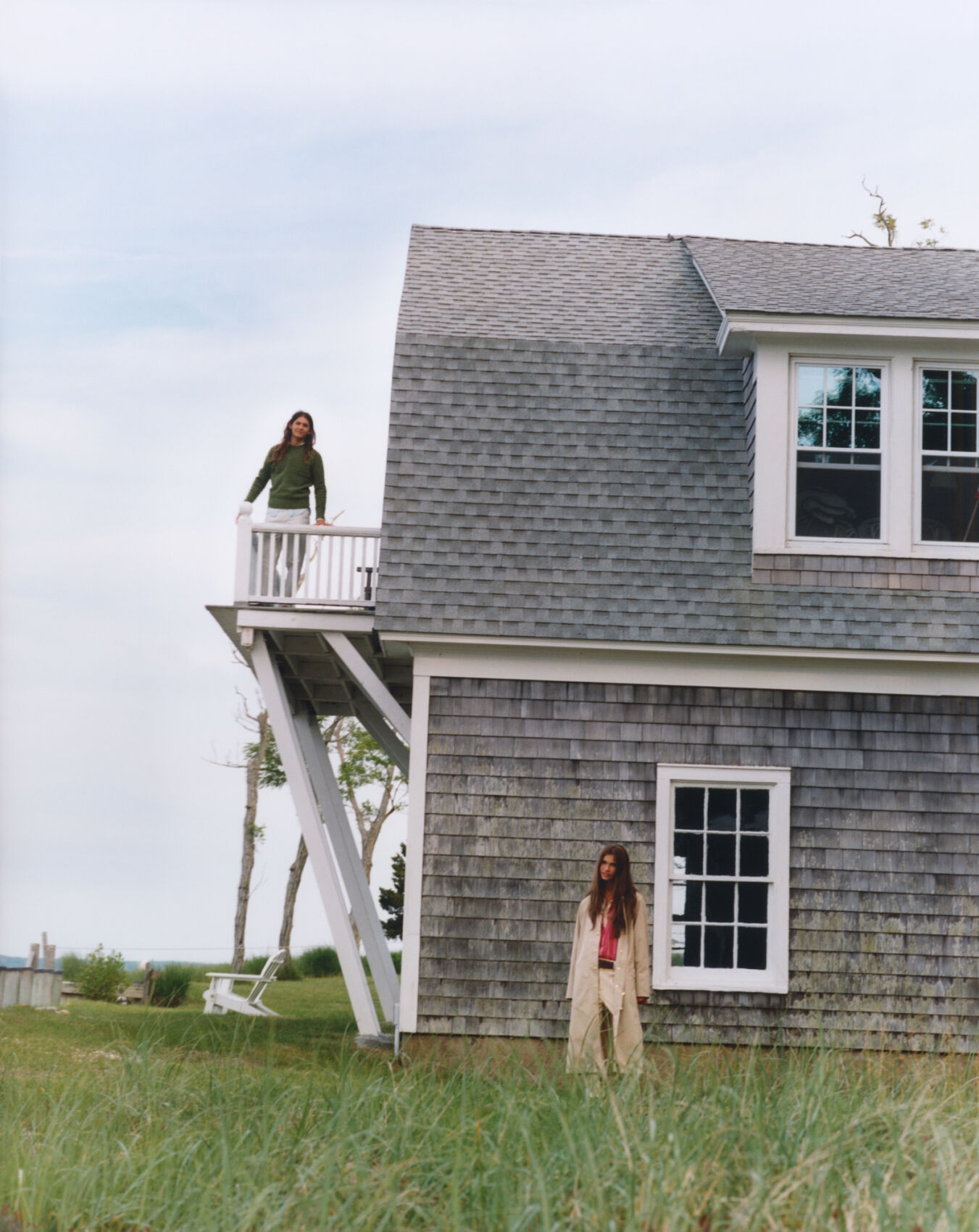 A quaint house with weathered shingles stands in a grassy area. A person in a green top leans on the white railing of a balcony, while another in a beige coat stands below near a window. The scene conveys a serene, coastal vibe with distant trees and a clear sky enhancing the tranquil atmosphere.