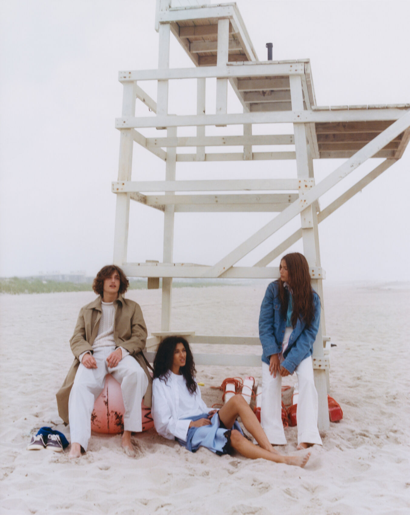 Three individuals are casually positioned under a tall, white lifeguard stand on a sandy beach. The muted, cloudy sky adds a soft backdrop. One person sits barefoot on a buoy, dressed in light clothing, while another leans against the structure. The scene captures a relaxed, summery atmosphere with the ocean and distant greenery visible in the background.