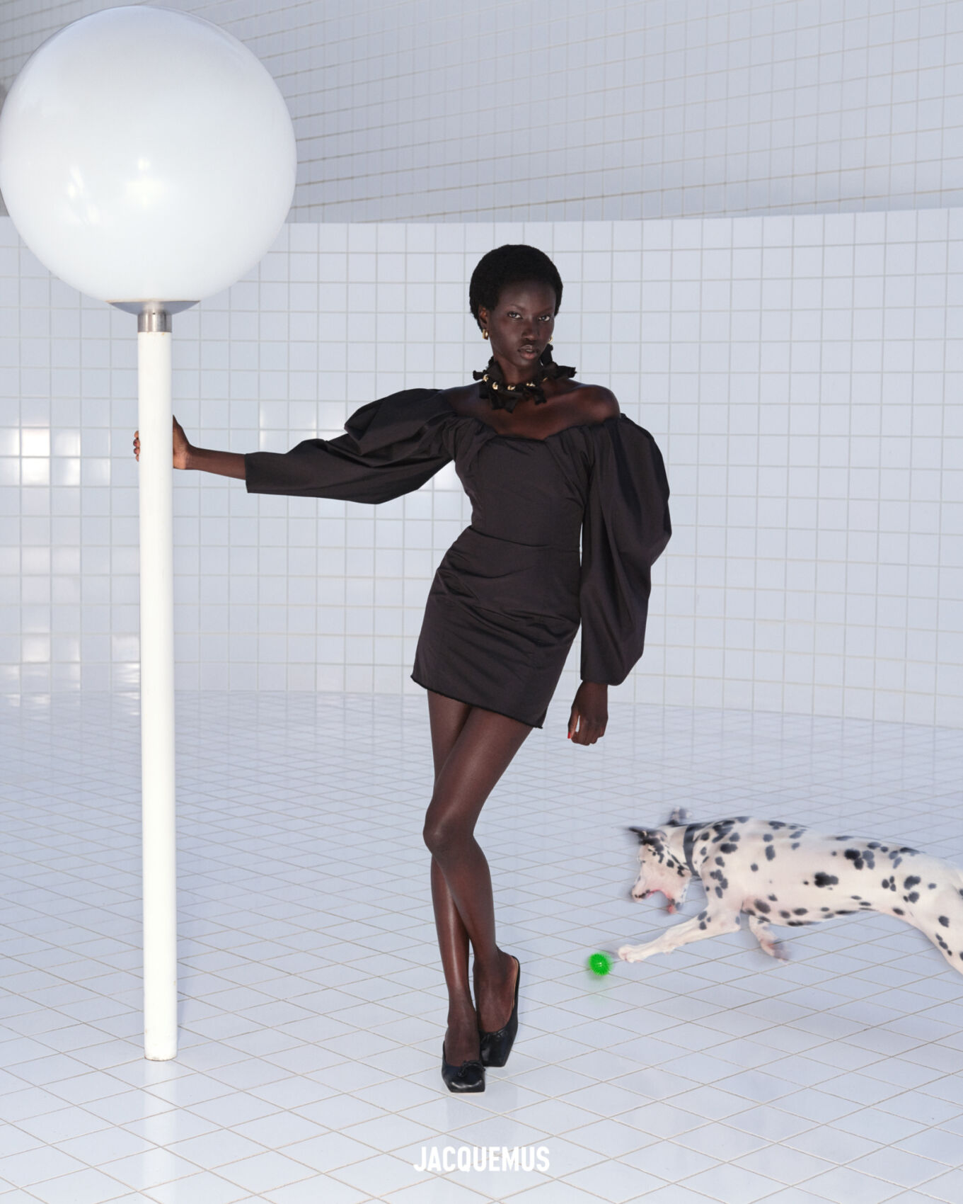 In a minimalist, tiled space, a woman stands elegantly in a dark, puff-sleeved dress, leaning against a tall, spherical light fixture. Her poised demeanor contrasts with a lively, black and white spotted dog, who energetically plays with a small green ball nearby. The scene exudes a blend of sophistication and playful energy within a bright, modern setting.