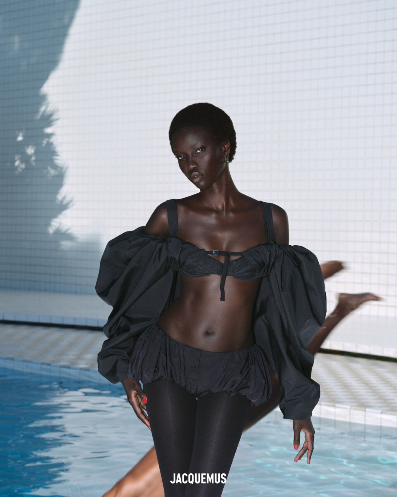 A person wearing an avant-garde, black off-shoulder outfit poses dramatically near a serene pool. The scene captures stark contrasts of shadow and light, with a tiled wall in the background. The play of reflections on the water and the boldness of the attire create a striking visual composition, highlighting elegance and modern fashion.
