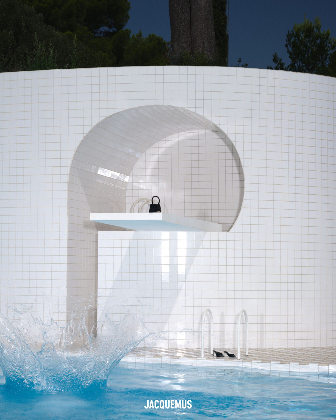 A serene outdoor setting features a sleek, white, tiled wall with an arch. A modern design shelf protrudes from the wall, displaying a small black purse. Below, a splash disrupts the calm blue water of a pool, suggesting movement or an object hitting the surface. Tall trees are visible in the background, enhancing the tranquil atmosphere.