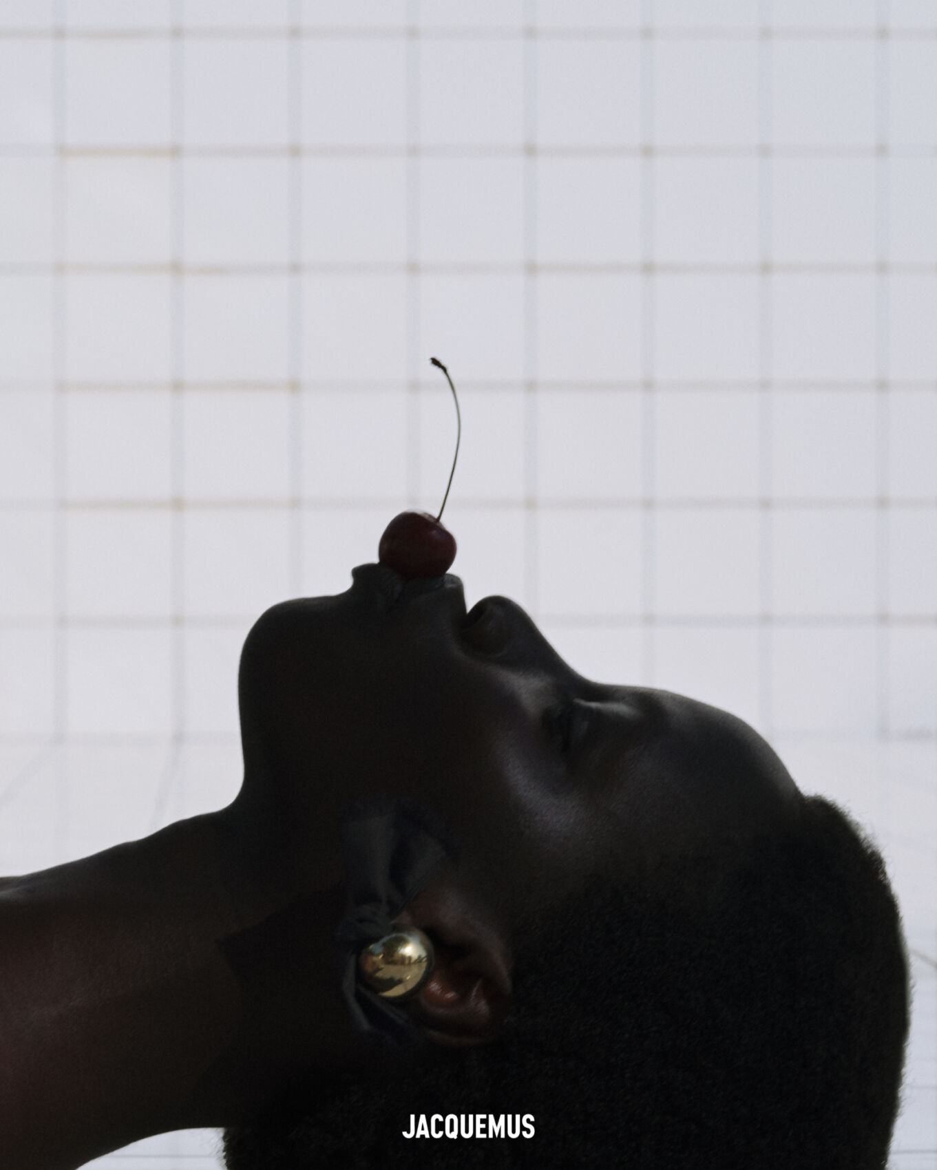 A silhouette of a person's profile is seen against a softly lit grid background. The individual holds a cherry delicately between their lips, its thin stem curving elegantly. Light reflects subtly off the large, shiny earring they wear. The contrast between the dark contour and the bright backdrop creates a striking and artistic composition.