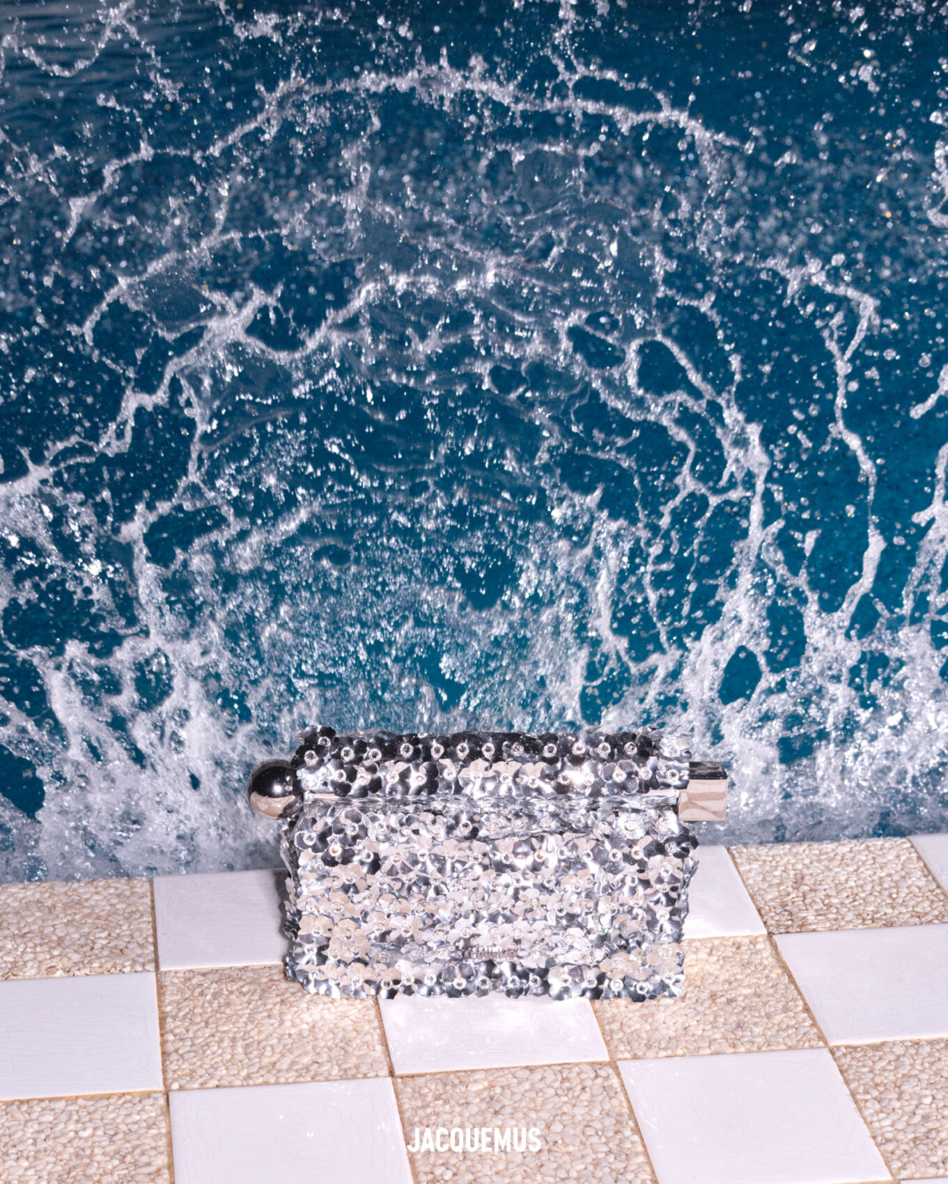 A textured bag, covered in what appears to be tiny crystals or beads, is placed on a tiled surface. The background features a dynamic swirling pattern of white and blue, resembling ocean waves or turbulent water. The scene blends elegance with natural elements, creating a striking visual contrast between the shimmering accessory and the flowing backdrop.