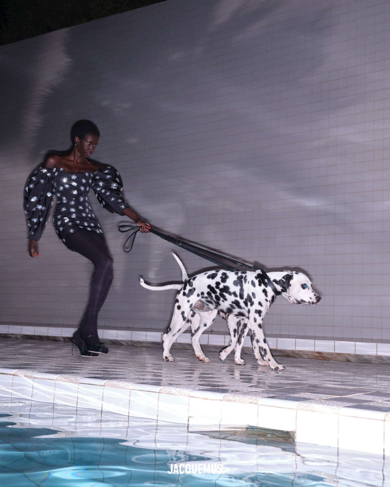 A person strides confidently beside a pool, dressed in a striking, polka-dotted outfit that matches the pattern of the Dalmatian dog they are walking. The scene is set against a tiled backdrop, with the water providing a reflective surface that enhances the overall effect of elegance and cohesion between the individual and the animal.