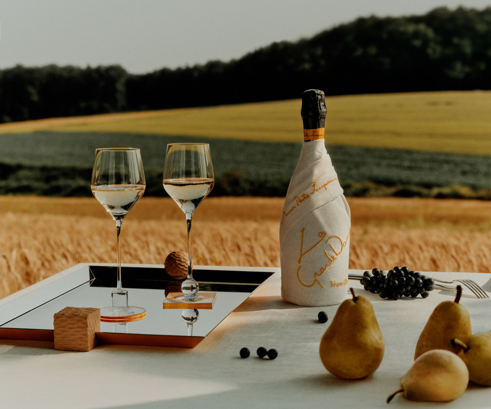 A serene scene features a table set elegantly with two wine glasses on a reflective tray, a wrapped bottle with golden text, and a small wooden block. Black grapes and ripe pears decorate the table. A lush backdrop of golden fields and dense green forest completes the tranquil, picturesque setting under a clear sky.