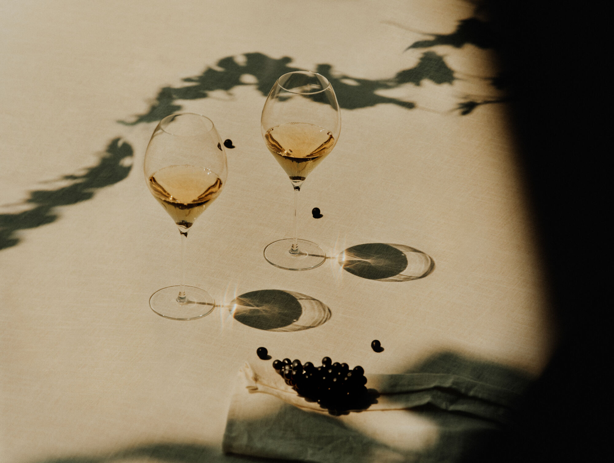 Two wine glasses filled with a golden liquid are elegantly placed on a light-colored surface, casting distinct shadows. A few dark berries are scattered nearby, and more berries rest on a folded napkin in the foreground. Soft shadows from foliage create an artistic play of light and form, adding a touch of nature's grace to the scene.