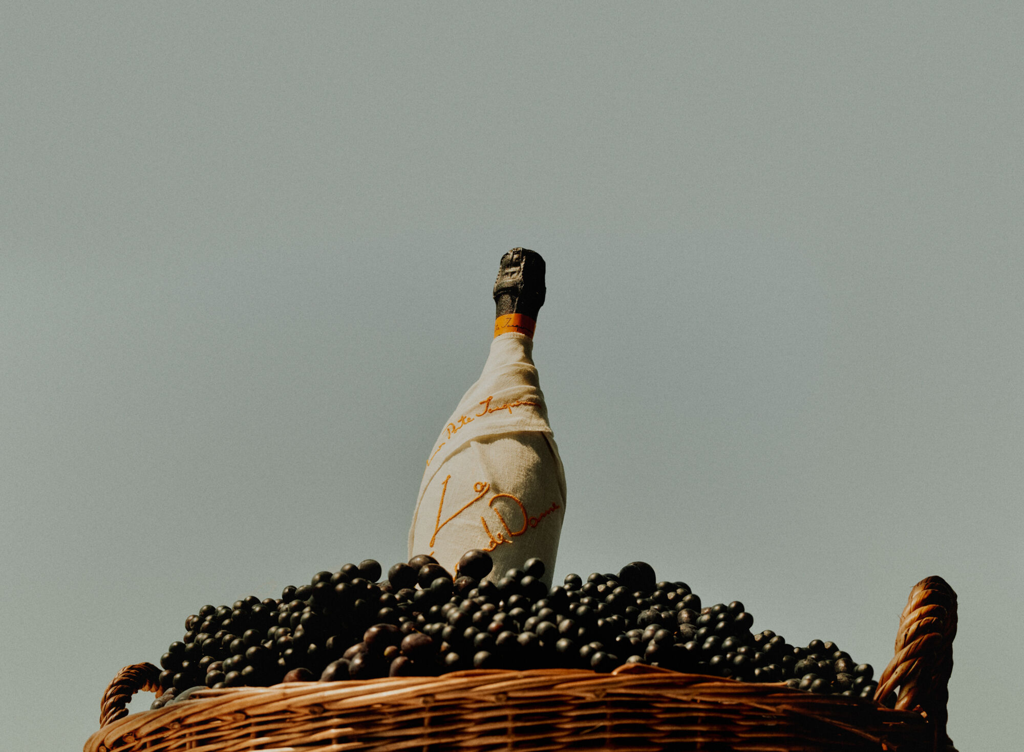 A wicker basket brimming with dark grapes supports a bottle wrapped in a cloth. The bottle is nestled upright among the grapes, its top slightly tilted. The setting has a sophisticated, rustic charm, with muted tones complementing the simplicity of the design. The backdrop is serene, offering a peaceful, minimalistic aesthetic that emphasizes the foreground elements.