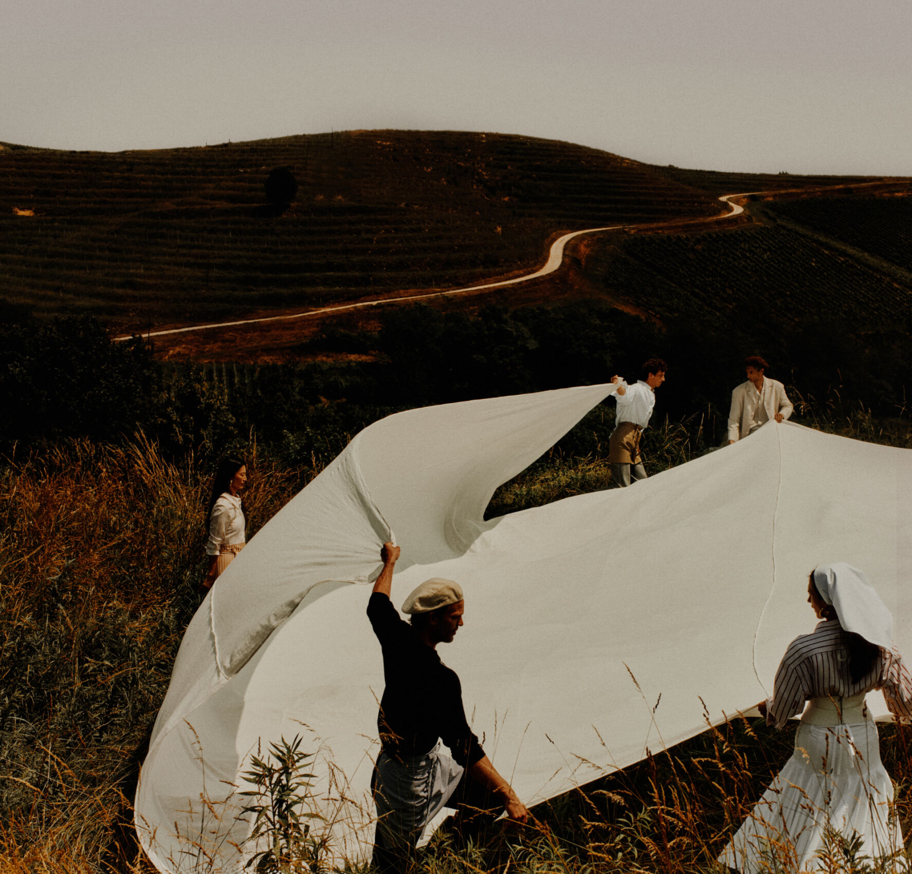 Several individuals are collaboratively spreading a large white sheet outdoors. They are standing in tall grass, and the setting features rolling hills with winding paths in the background. The atmosphere is serene, and the scene suggests teamwork and harmony with nature. The attire of the individuals varies, adding a touch of diversity to the gathering.