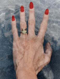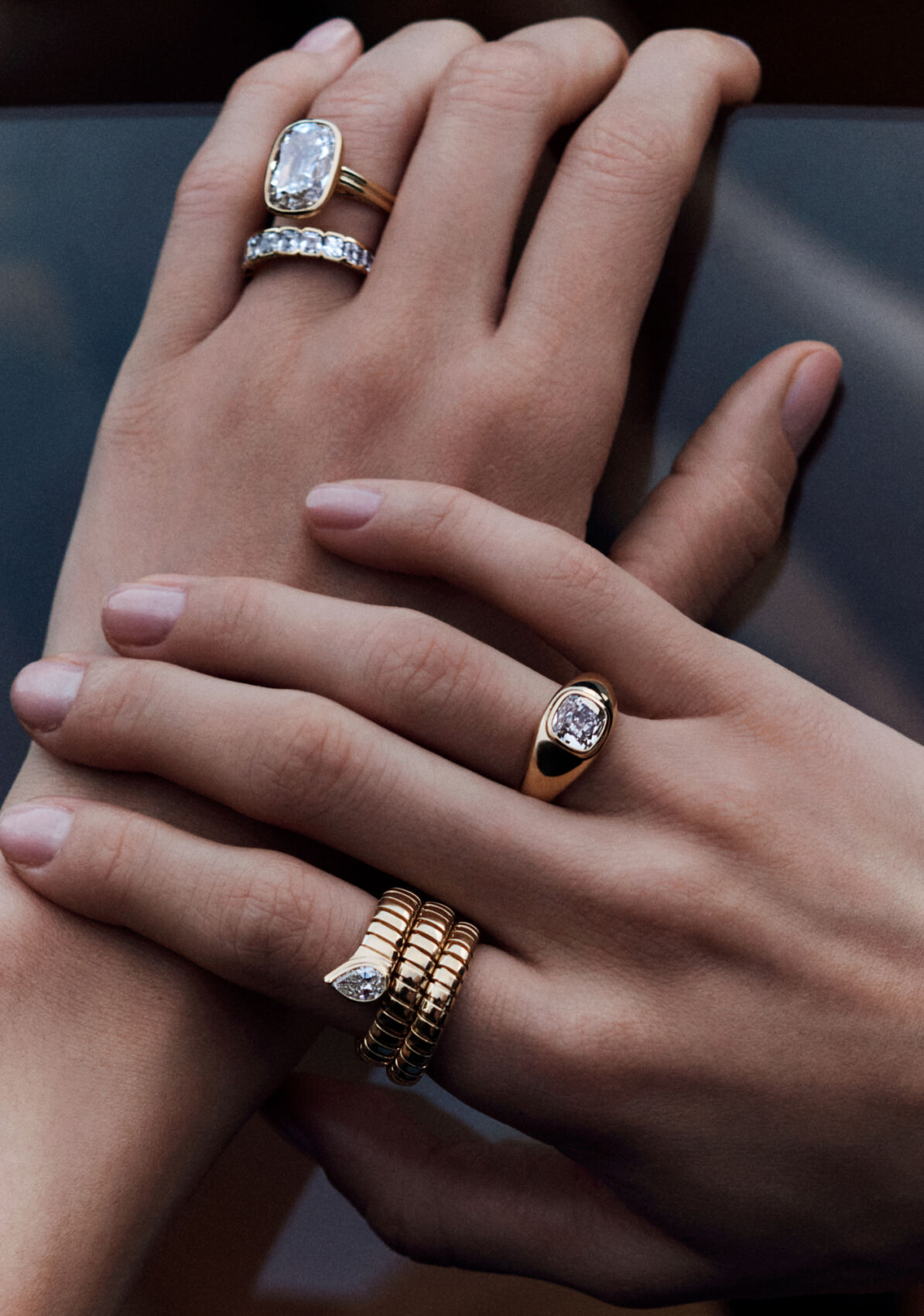 A person with dark hair holds a hand over one eye, showcasing elegant jewelry. A large diamond ring adorns their finger, while a sophisticated bracelet wraps around the wrist. The nails are polished in a neutral tone. The lighting creates a dramatic contrast, emphasizing the smooth texture of the skin and the sparkling jewels.