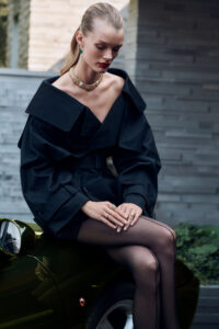 A woman reclines gracefully, wearing a sleek black satin dress adorned with small beads. Her elegant jewelry includes sparkling earrings, a watch, and a ring. Her pose is relaxed yet poised, with her head resting on one hand. Her expression is serene, set against a dark background that emphasizes her sophisticated appearance and timeless style.