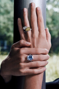 A collection of six rings is elegantly arranged on a soft, pastel background with swirling blue and beige hues. The rings feature intricate designs, showcasing a variety of gemstones, including vibrant green and deep blue stones, along with clear, sparkling diamonds. The bands vary in style, some gold, others silver, creating a luxurious and artistic display.
