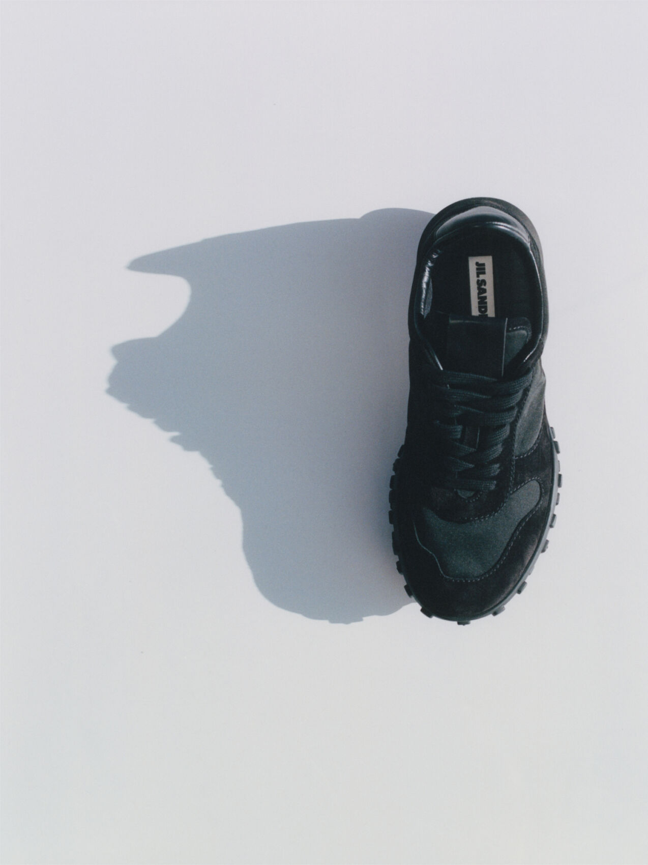 A single black sneaker with a rugged, textured sole is positioned on a smooth, light background. The shoe's laces are tightly tied, and the material appears soft, possibly suede or leather. A stark shadow stretches out to the left, contrasting with the clean, minimalistic space. The overall composition is balanced and stylish, emphasizing simplicity and elegance.