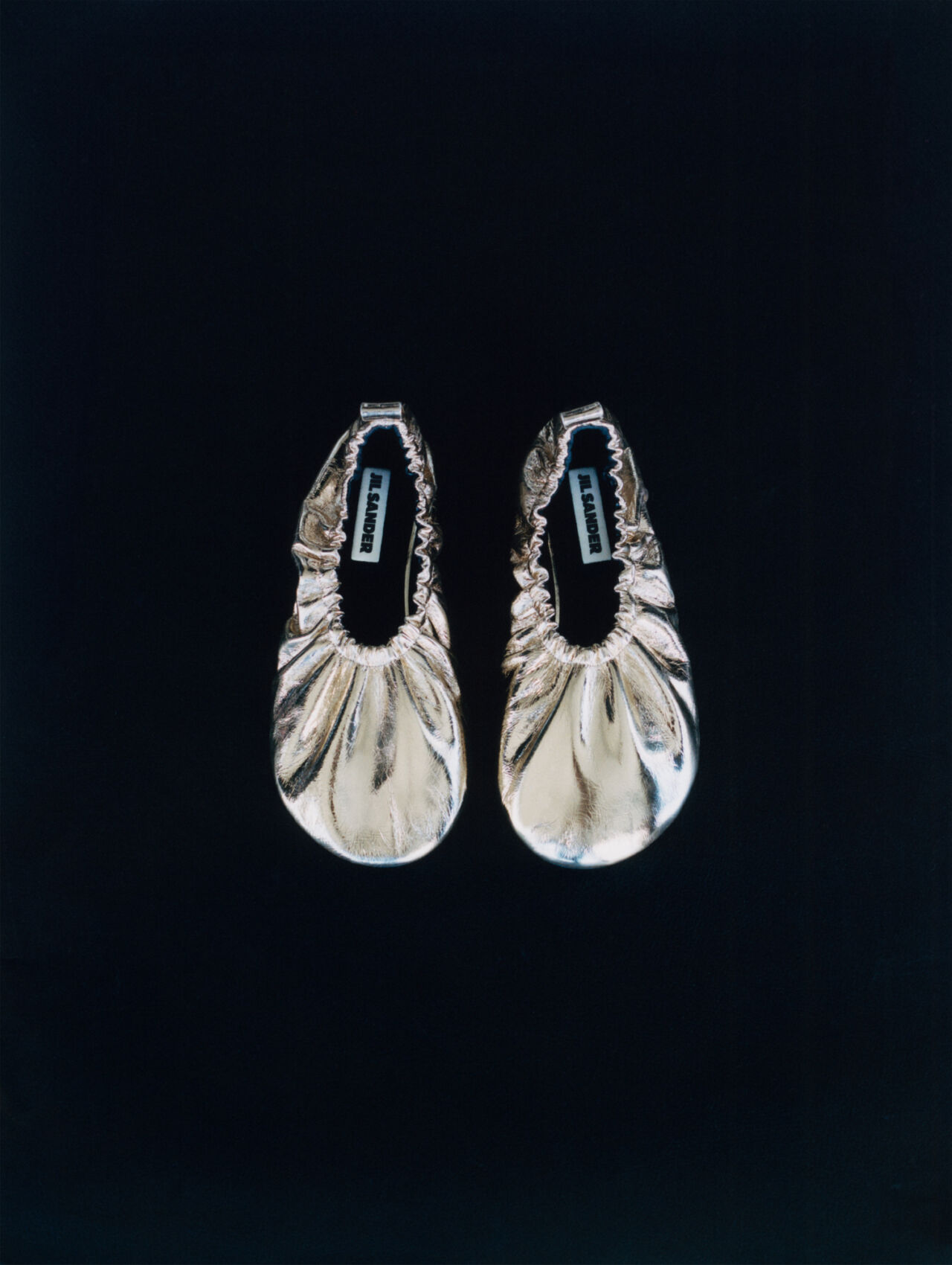 A pair of gold, metallic ballet flats are set against a dark background. The crinkled, glossy material reflects light, creating a luxurious appearance. The shoes have a ruched detailing along the edge and a soft, rounded toe, emphasizing elegance and sophistication. Positioned symmetrically, they convey a sense of simplicity and understated glamour suitable for various occasions.