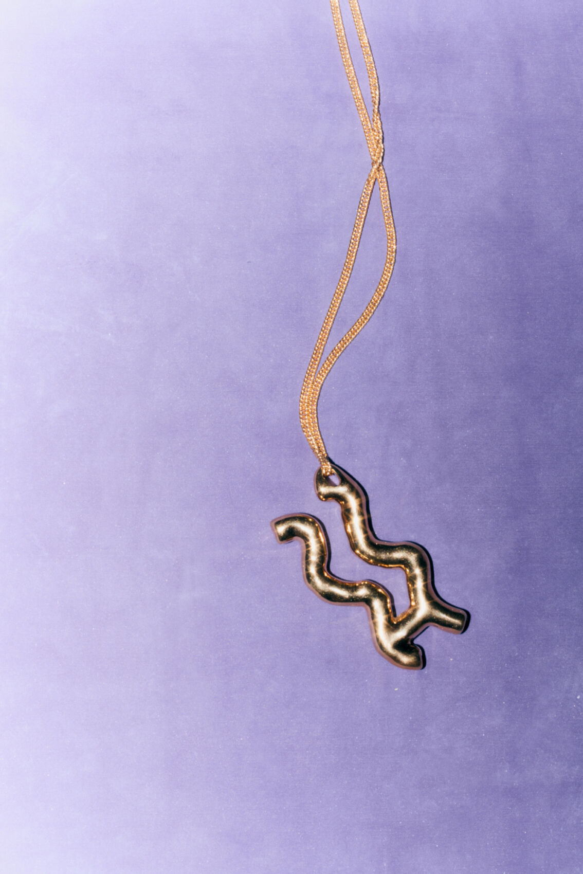 A curvy metallic pendant hangs from a thin, golden chain against a soft purple background. The pendant's reflective surface catches the light, creating glimmers that highlight its unique, wave-like design. The simple yet elegant form contrasts with the understated background, emphasizing the pendant's artistic and organic shape, accentuated by the delicate drape of the chain.