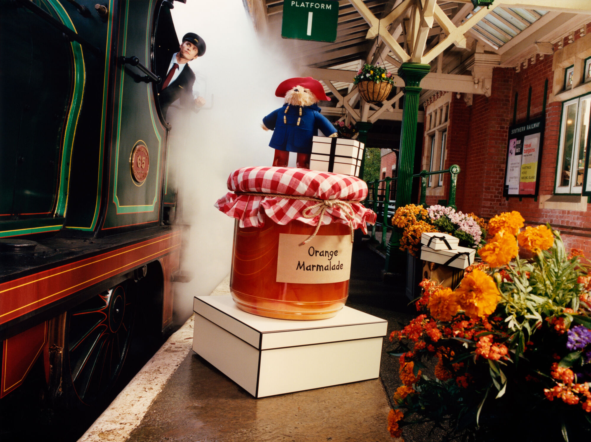 A steam locomotive with a driver emerges onto a railway platform, surrounded by vivid floral decorations. A plush figure in a blue coat and red hat stands beside an oversized jar of orange marmalade on white boxes. The platform is bustling with vibrant colors and architectural details, evoking a nostalgic, whimsical scene.