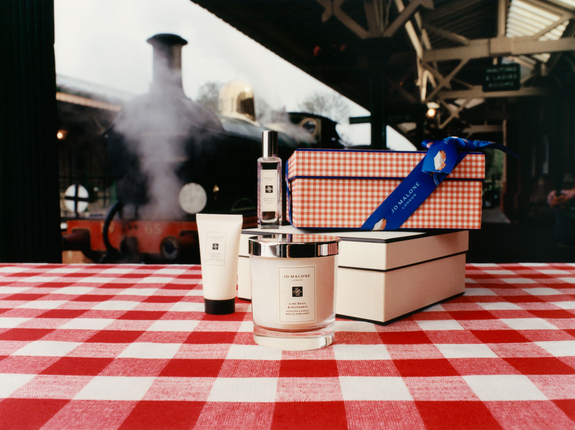 A vintage train emits steam at a station, blending heritage aesthetics with luxury items displayed on a red and white checkered tablecloth. A prominent candle, a tube, and a small bottle share the scene with stacked gift boxes tied with a blue ribbon. The juxtaposition evokes a sense of elegance and timelessness. The background features ironwork and distant trees.